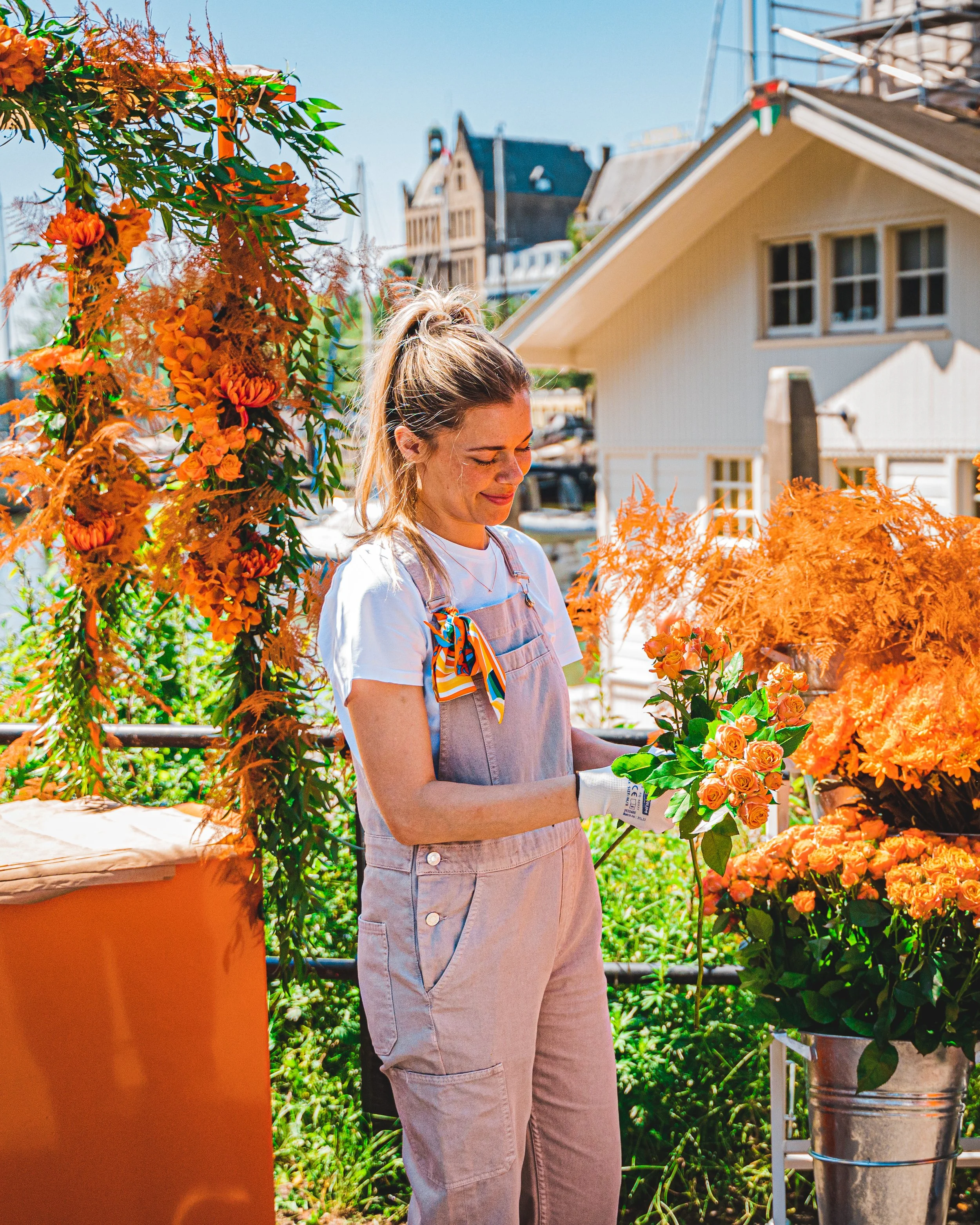 Working with Hermès for the Le Monde d’Hermès Kiosk in Rotterdam, Studio Bloement designed floral elements that reflected the Maison’s iconic style, while connecting with the natural beauty of Dutch flowers. Our foam-free techniques and bespoke designs ensured that the event not only looked beautiful but also stayed true to sustainable practices. The combination of iconic orange bouquets, floral table decorations, and the floral stall created an immersive experience that allowed visitors to engage deeply with the Hermès Maison while enjoying the natural beauty of the floral arrangements.